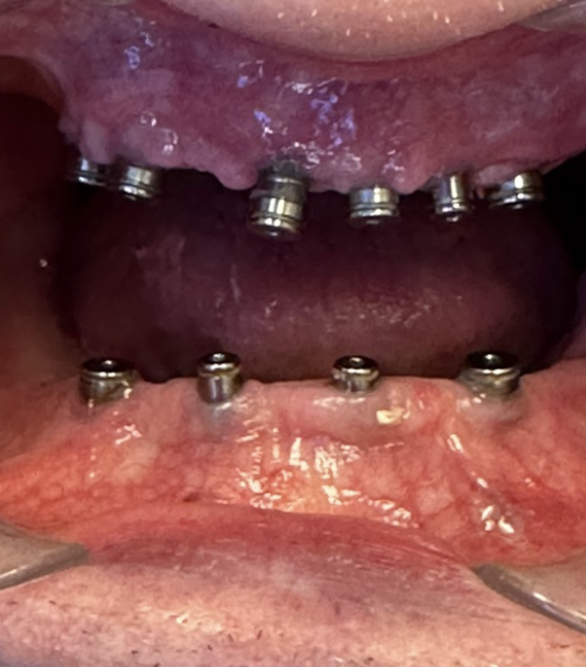 The best options for implant placement were determined by the CT scans, taking into consideration bone availability. According to the scan, six implants were placed on the upper arch, and due to bone issues, four implants were placed on the lower. The patient would then be sent home with a removable prosthesis awaiting healing.